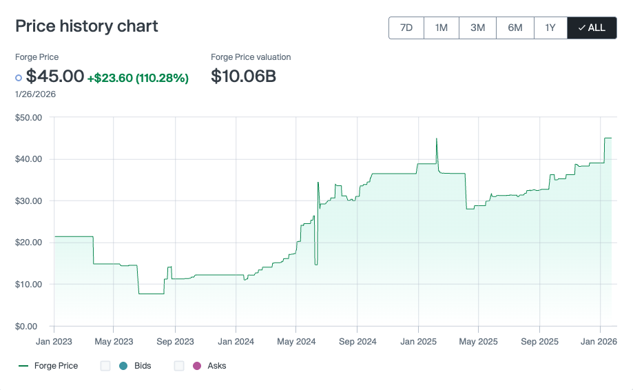 Cerebras' Forge Price is $45.00 at an implied $10.06 billion valuation, as of early January 2026, which represents a 20% premium to its last primary funding round in September 2025.22 Forge Price is a derived data point that reflects the up-to-date price performance of venture-backed, late-stage companies, and is calculated based on a proprietary model incorporating pricing inputs from primary funding round information, secondary market transactions on Forge.