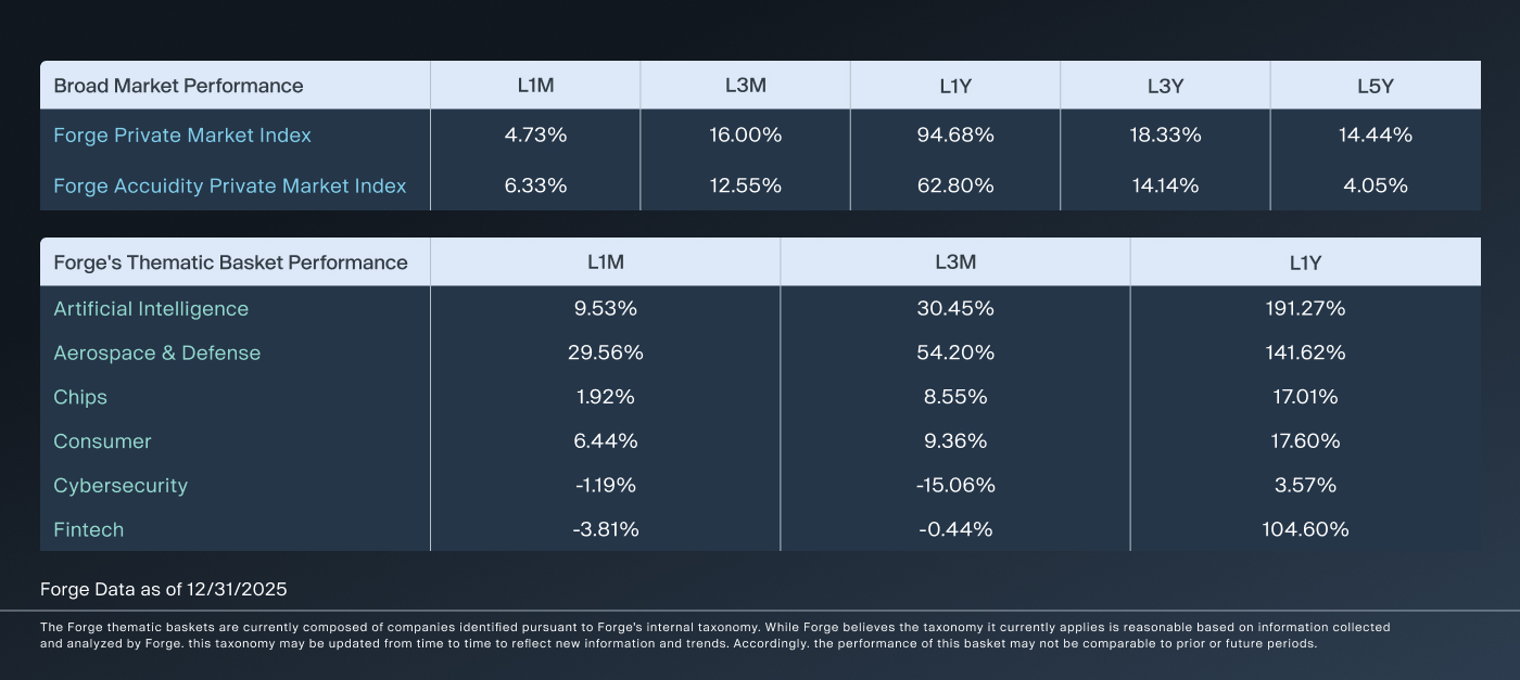 Forge Price™ is calculated and disseminated by Forge Data LLC (“Forge Data”). All rights reserved. Forge Price is designed to reflect the up-to-date price performance of venture-backed, late-stage companies. Forge Price is determined based on a proprietary model incorporating the pricing inputs from primary founding round information and secondary market transactions, including indications of interest (IOIs). Secondary market transactions are sourced from Forge Securities LLC (an affiliate of Forge Data), a leading market platform, and data collected from other private market trading platforms. The Forge Price is a mark of Forge Data. The Forge Price is solely for informational purposes and is based upon information from sources believed to be reliable, however Forge Data makes no assurance as to the accuracy or reliability of this data. Forge Data is not an investment adviser and makes no representation regarding the advisability of investing in any asset or asset class. Private company securities are highly illiquid, and the Forge Price may rely on a very limited number of trade and/or IOI inputs in its calculation. Brokerage products and services are offered by Forge Securities LLC, a registered broker-dealer and member FINRA/SIPC. Neither reference to company names, nor calculation of Forge Price for a particular company(ies) implies any affiliation between Forge or its affiliates and any company, any endorsement or sponsorship of Forge or its affiliates by any company or vice versa, or any partnership, joint venture or other commercial relationship between Forge or its affiliates and any company. Rights with respect to any company marks referred to herein are, as between Forge and its affiliates and such company, owned by the company.