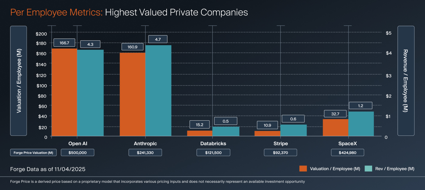 We looked at several of the highest-valued private companies — OpenAI, SpaceX, Anthropic, Databricks, and Stripe — and compared their valuation and revenue per employee. Each of these companies has a Forge PriceTM Valuation around or well above $100 billion,1 but they differ widely in sector, business model, and stage of maturity. Viewing them through a per-employee lens gives a unique look at financial and operational efficiency.