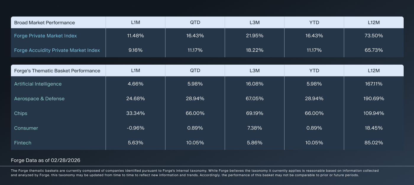 The Forge Private Market Index is calculated and disseminated by Forge Data and is a mark of Forge Data. All rights reserved. The Forge Private Market Index is solely for informational purposes and is based upon information from sources believed to be reliable. It is not possible to invest in the Forge Private Market Index, and Forge Data makes no assurance that any investment products based on or underlying the Forge Private Market Index will accurately track index performance or provide positive investment performance. Forge Data is not an investment adviser and makes no representation regarding the advisability of investing in any asset classes or investment vehicles. This is not a recommendation, offer, solicitation of an offer, or advice to buy or sell securities by Forge Securities LLC (“Forge Securities”) or any of its affiliates, nor an offer of brokerage services in any jurisdiction where Forge Securities is not permitted to offer brokerage services. Registered representatives of Forge Securities do not (1) advise any party on the merits of a particular transaction; (2) assist in the determination of fair value of any security; or (3) provide legal, tax, or transactional advisory services. Securities and investments are offered only to customers of Forge Securities, a registered broker-dealer and member FINRA & SIPC. Securities referenced in this article may be offered by Forge Securities, and certain Forge affiliates may act as principals in such transactions. See Forge Global, Inc. and its affiliates’ Disclosure Library (Disclaimers & Disclosures and Form CRS) for additional disclosures. Private company securities are highly illiquid, and the Forge Private Market Index may rely on a very limited number of trade and/or indication of interest inputs in its calculation. Brokerage products and services are offered by Forge Securities, a registered broker-dealer and member FINRA/SIPC. By downloading this content, you acknowledge that you have reviewed and are subject to the Forge Private Market Index disclaimers and disclosures which contains other important disclaimers, disclosures and restrictions related to the Forge Private Market Index. Additionally, if you are accessing this content away from forgeglobal.com, you acknowledge that you have reviewed and are subject to Forge’s Terms of Use with respect to use and distribution of information as if you were accessing this content on forgeglobal.com.
