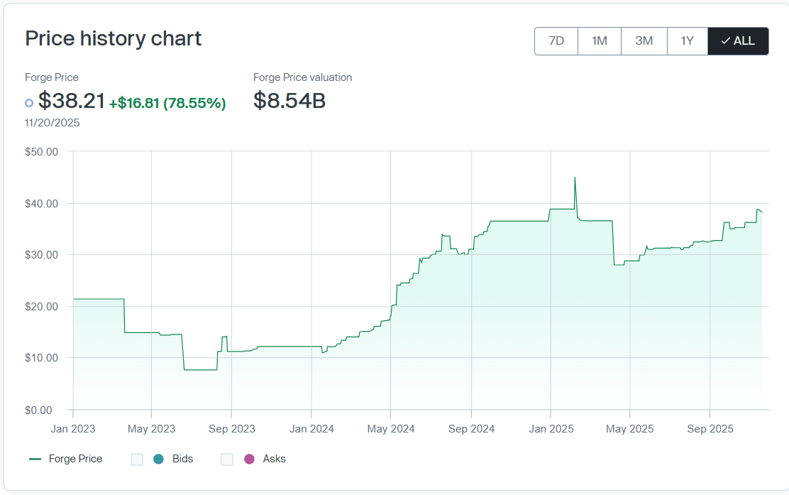 That's around where the Cerebras Forge Price sits at the end of October, though it's slightly up at $36.73, implying an $8.21 billion valuation 19.