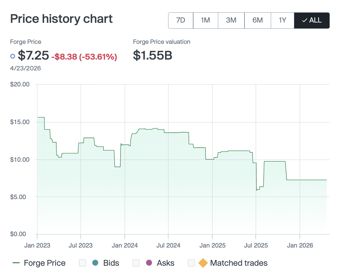 However, Chainalysis' Forge Price has stumbled significantly since then. It currently sits at $7.25 as of early March 2026, implying a $1.55 billion valuation.29