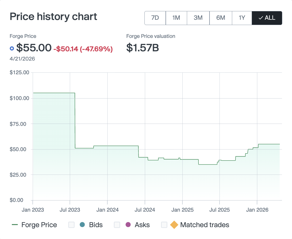 Forge Price is a derived data point that reflects the up-to-date price performance of venture-backed, late-stage companies, and is calculated based on a proprietary model incorporating pricing inputs from primary funding round information and secondary market transactions on Forge.