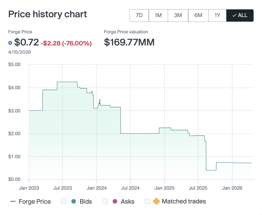 Forge Price is a derived data point that reflects the up-to-date price performance of venture-backed, late-stage companies, and is calculated based on a proprietary model incorporating pricing inputs from primary funding round information and secondary market transactions on Forge.