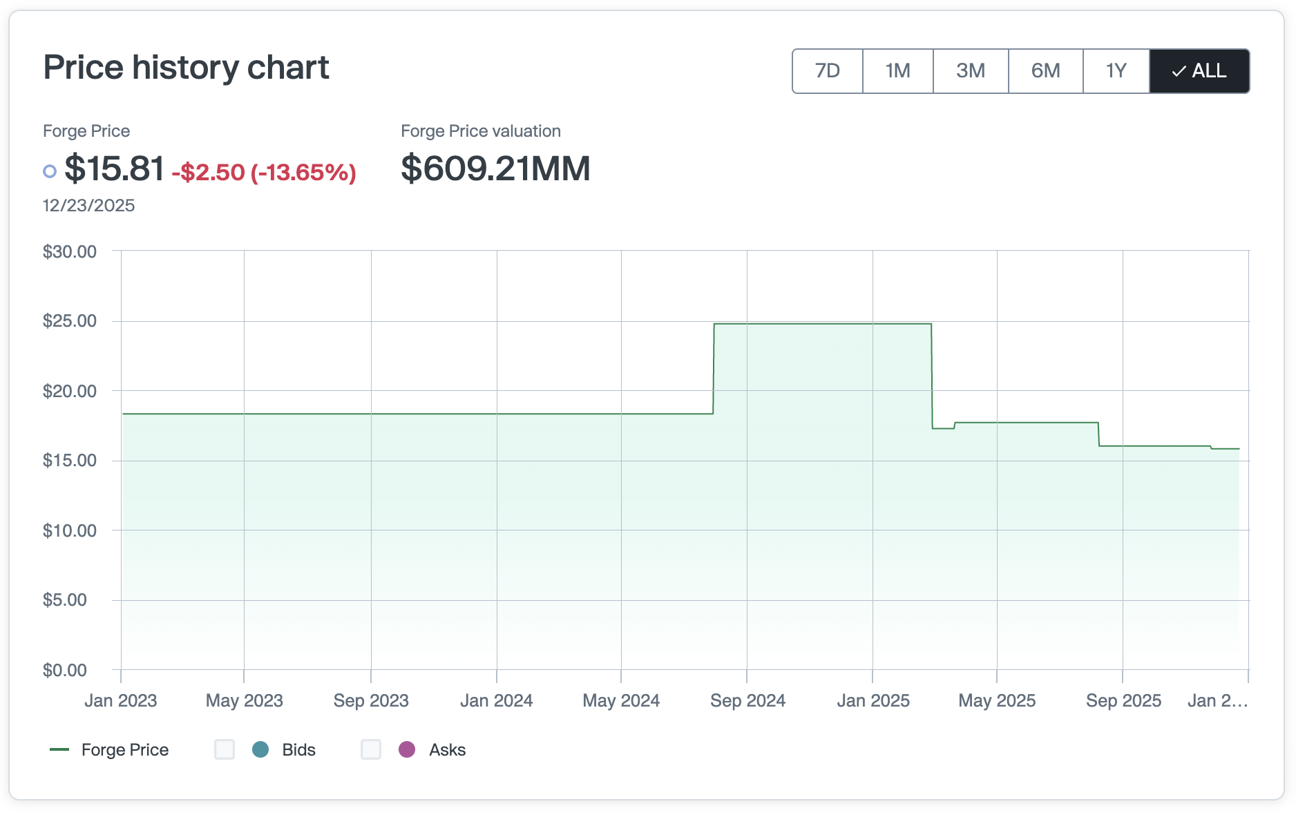 Forge Price is a derived data point that reflects the up-to-date price performance of venture-backed, late-stage companies, and is calculated based on a proprietary model incorporating pricing inputs from primary funding round information, secondary market transactions, and indications of interest (IOIs) on Forge.