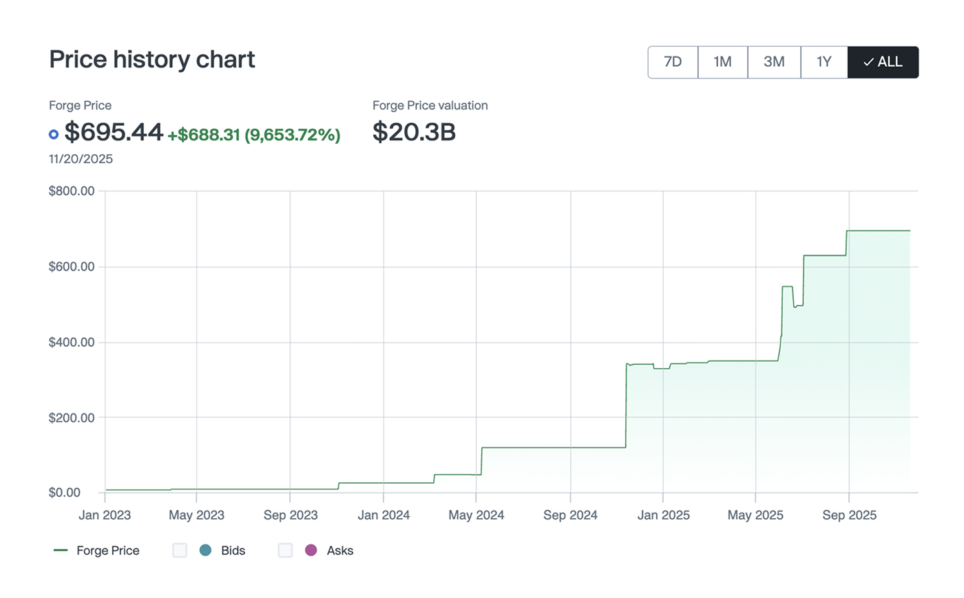 Forge Price is a derived data point that reflects the up-to-date price performance of venture-backed, late-stage companies. It is calculated using a proprietary model that incorporates pricing inputs from primary funding round information, secondary market transactions, and volume of bids/asks on the Forge marketplace.