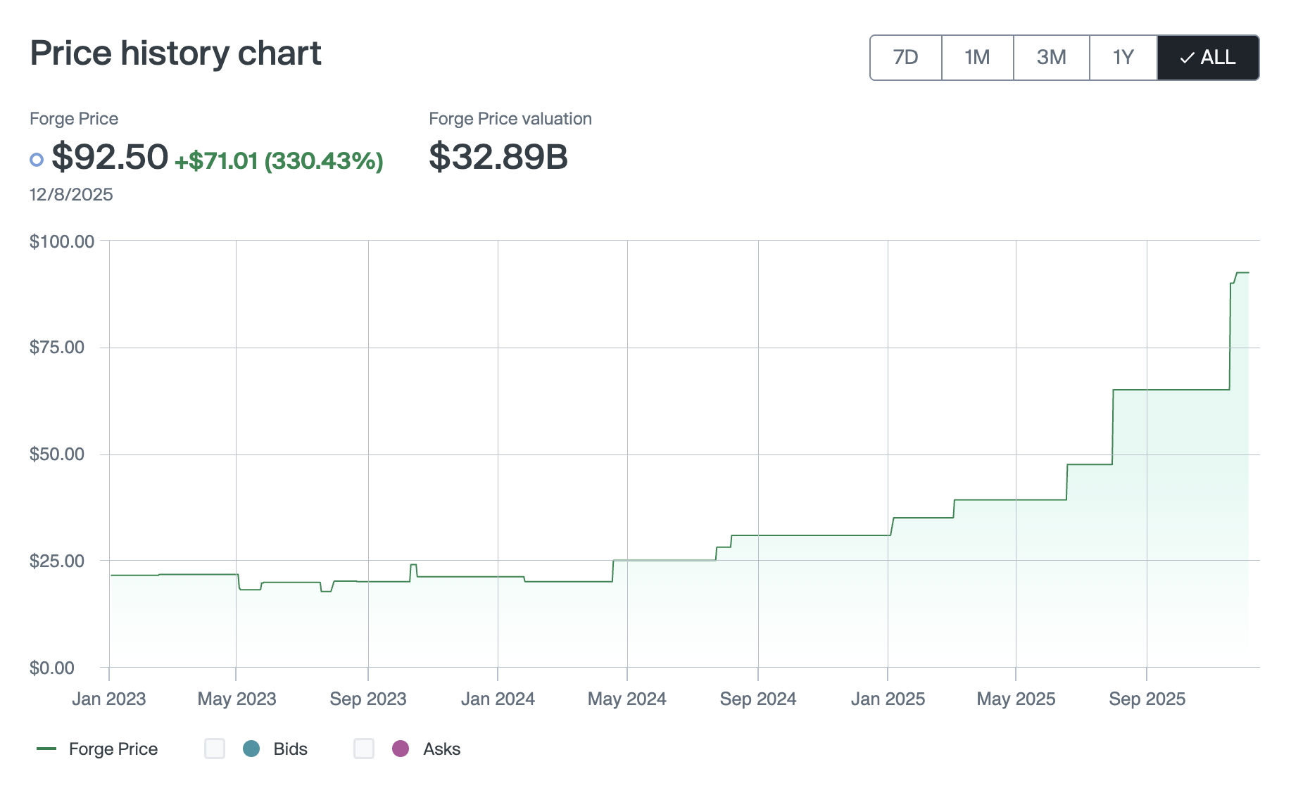 Forge Price is a derived data point that reflects the up-to-date price performance of venture-backed, late-stage companies, and is calculated based on a proprietary model incorporating pricing inputs from primary funding round information, secondary market transactions, and indications of interest (IOIs) on Forge.