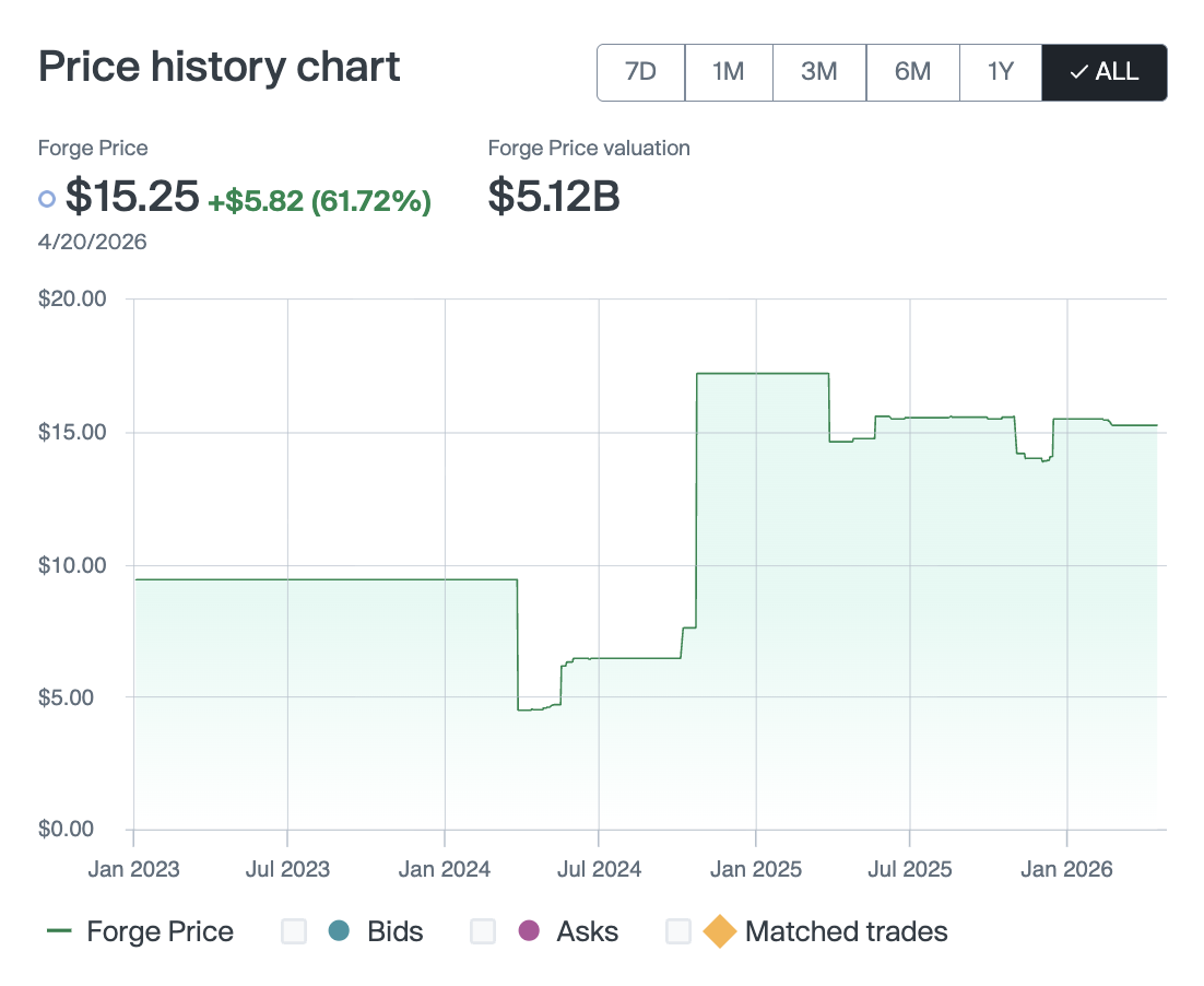 Forge Price is a derived data point that reflects the up-to-date price performance of venture-backed, late-stage companies, and is calculated based on a proprietary model incorporating pricing inputs from primary funding round information and secondary market transactions on Forge.