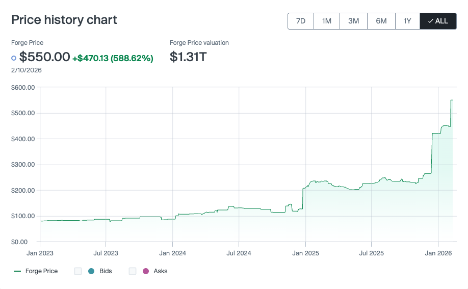 The following year, in December 2025, another tender offer took SpaceX's valuation to $800 billion, and its Forge Price jumped all the way to $421. Now, SpaceX's Forge Price is $550 as of early February 2026, up about 138% over the past year. That equates to a $1.05 trillion valuation, but it's possible the Forge Price will rise more in line with the new valuation from the combined company.25