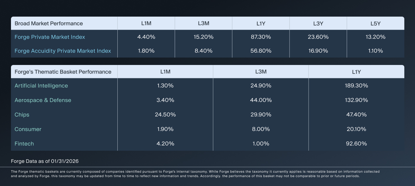 Forge Price™ is calculated and disseminated by Forge Data LLC (“Forge Data”). All rights reserved. Forge Price is designed to reflect the up-to-date price performance of venture-backed, late-stage companies. Forge Price is determined based on a proprietary model incorporating the pricing inputs from primary founding round information and secondary market transactions, including indications of interest (IOIs). Secondary market transactions are sourced from Forge Securities LLC (an affiliate of Forge Data), a leading market platform, and data collected from other private market trading platforms. The Forge Price is a mark of Forge Data. The Forge Price is solely for informational purposes and is based upon information from sources believed to be reliable, however Forge Data makes no assurance as to the accuracy or reliability of this data. Forge Data is not an investment adviser and makes no representation regarding the advisability of investing in any asset or asset class. Private company securities are highly illiquid, and the Forge Price may rely on a very limited number of trade and/or IOI inputs in its calculation. Brokerage products and services are offered by Forge Securities LLC, a registered broker-dealer and member FINRA/SIPC. Neither reference to company names, nor calculation of Forge Price for a particular company(ies) implies any affiliation between Forge or its affiliates and any company, any endorsement or sponsorship of Forge or its affiliates by any company or vice versa, or any partnership, joint venture or other commercial relationship between Forge or its affiliates and any company. Rights with respect to any company marks referred to herein are, as between Forge and its affiliates and such company, owned by the company.