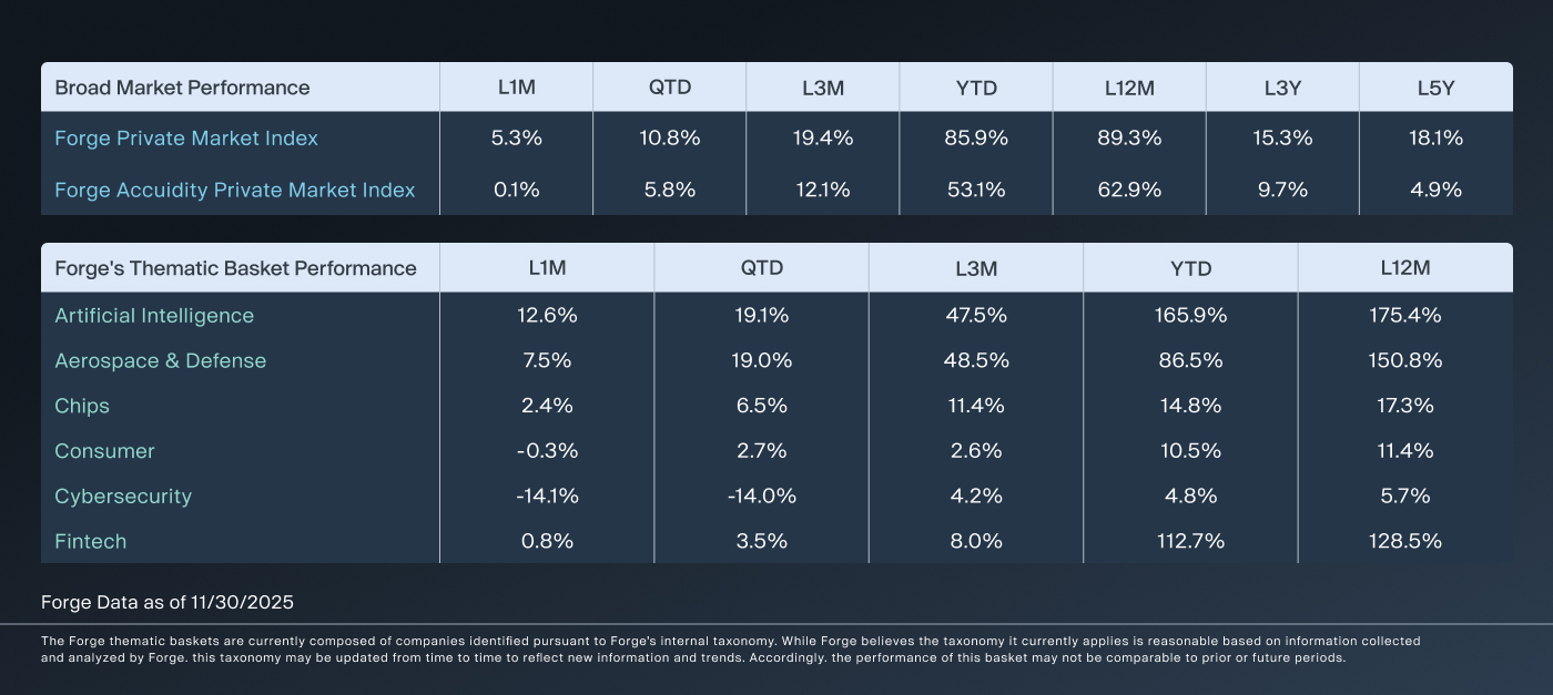 - The Forge Private Market Index (FPMI), ended November at +5.3%
