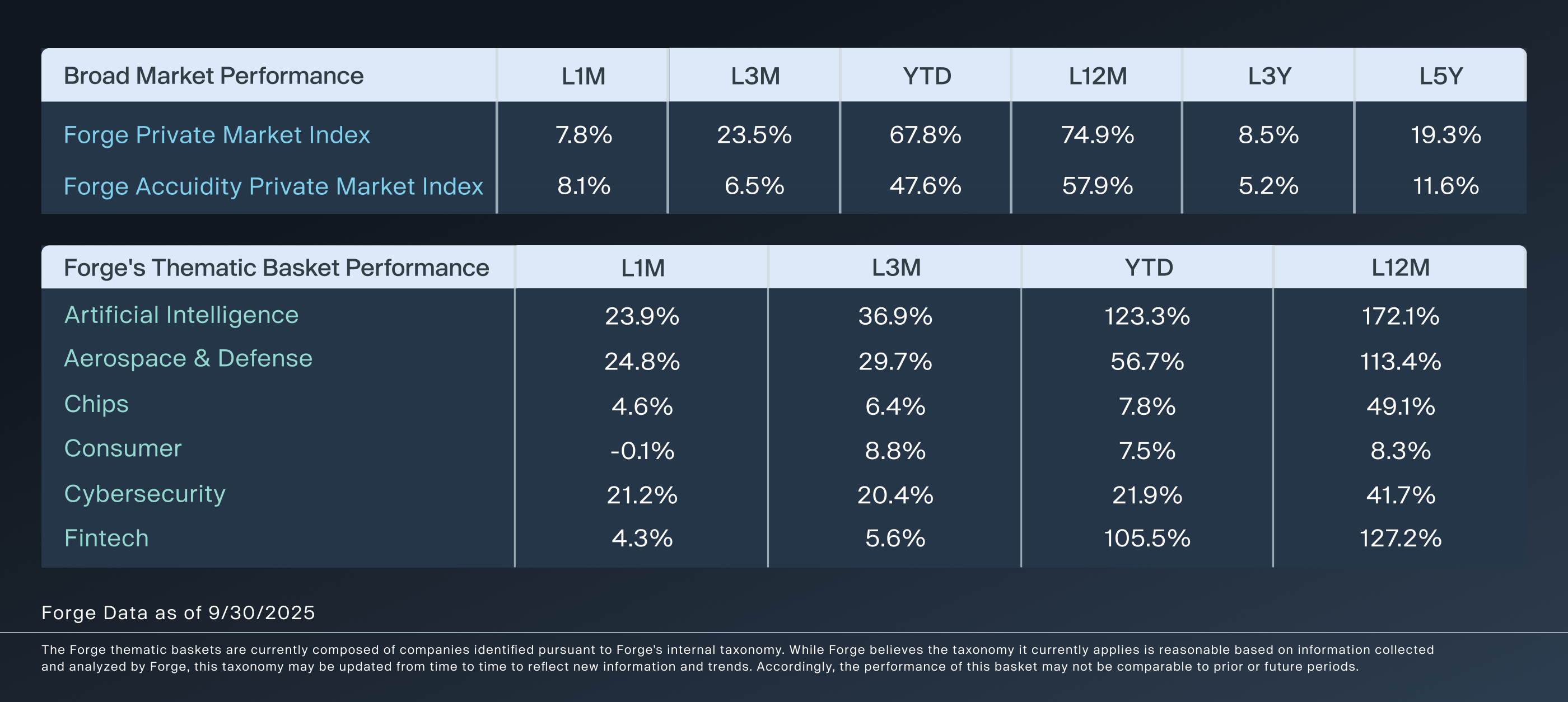 The information contained herein is based on currently available information, and Forge undertakes no obligation to update any of such information or to reflect new information or the occurrence of unanticipated events, except as required by law. While Forge believes such information forms a reasonable basis for the contents of this Private Market Update, such information may be limited or incomplete, and this content should not be read to indicate that Forge has conducted an exhaustive inquiry into, or review of, all potentially available relevant information. This Private Market Update contains trademarks, service marks, trade names and copyrights of Forge and may contain those of other companies, which are the property of their respective owners. The use or display of third parties’ trademarks, service marks, trade names or products is not intended to, and does not imply, a relationship with Forge or any of its respective affiliates, or an endorsement or sponsorship by or of Forge or such affiliates. Solely for convenience, some of the trademarks, service marks, trade names and copyrights referred to in this Private Market Update may be listed without the TM, SM, (c) or (R) symbols, but Forge will assert, to the fullest extent under applicable law, the right of the applicable owners, if any, to these trademarks, service marks, trade names and copyrights. The performance shown represents past performance, and past performance is not indicative of future results.