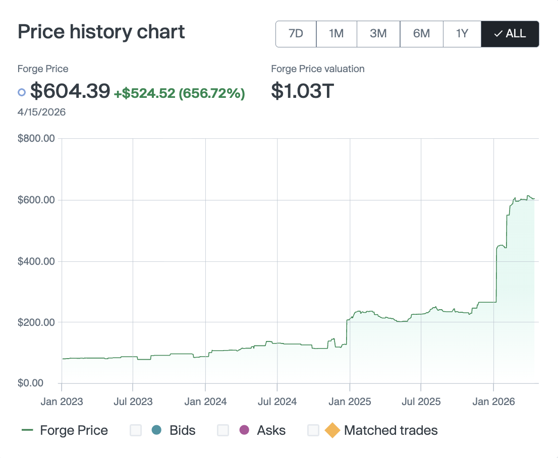 SpaceX's Forge Price is $604.39 at a $1.03 trillion Forge Price Valuation, as of April 15, 2026. This compares to a $118.59 Forge Price (about $211.77 billion valuation) cited in January 2025.23